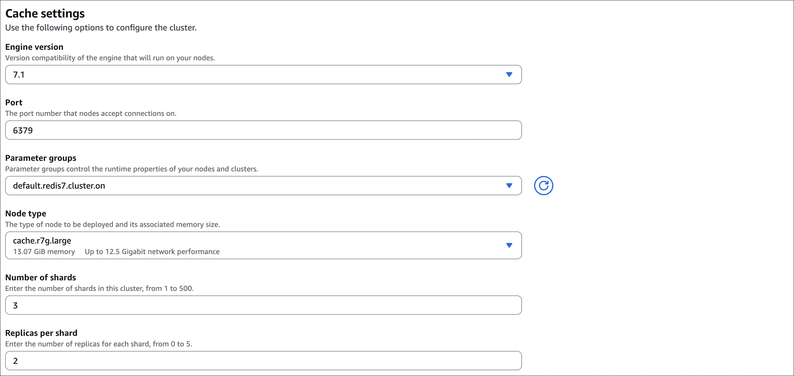 cache.r7g.large)- The type of node to be deployed and its associated memory size