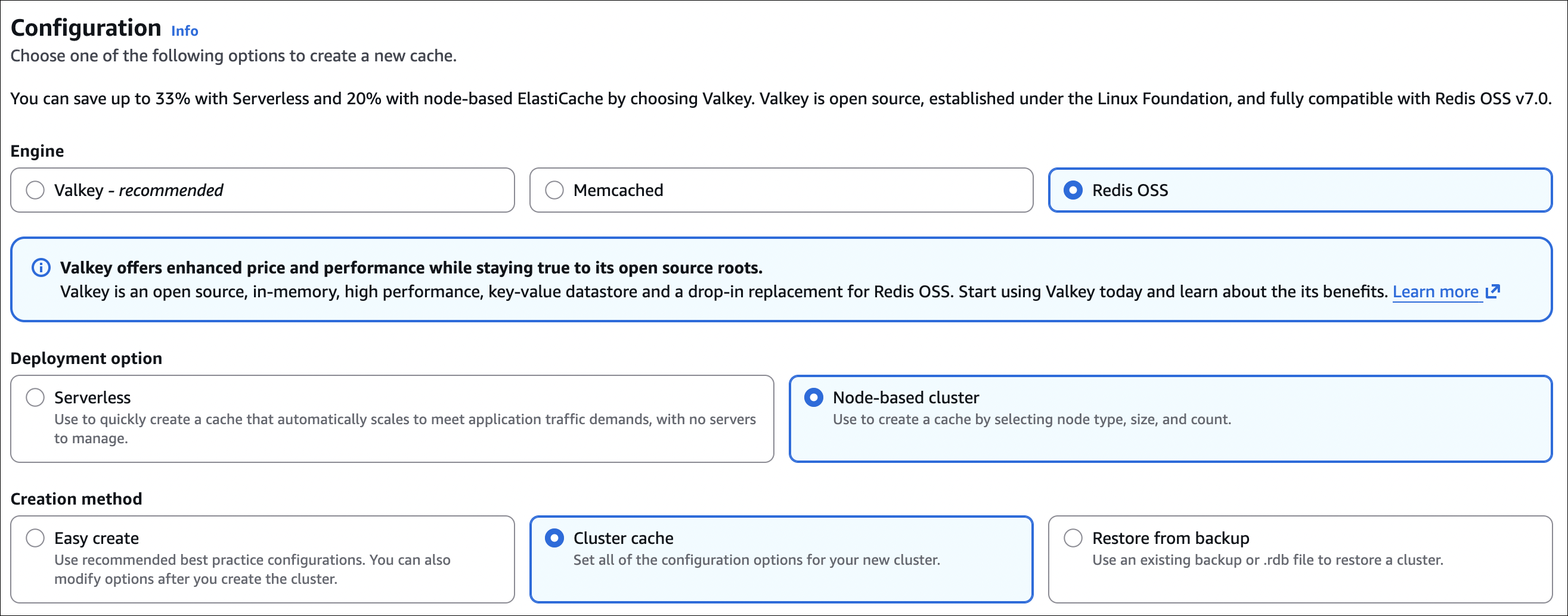 - Valkey (recommended) - Open source, compatible with Redis OSS v7.0, better price/performance