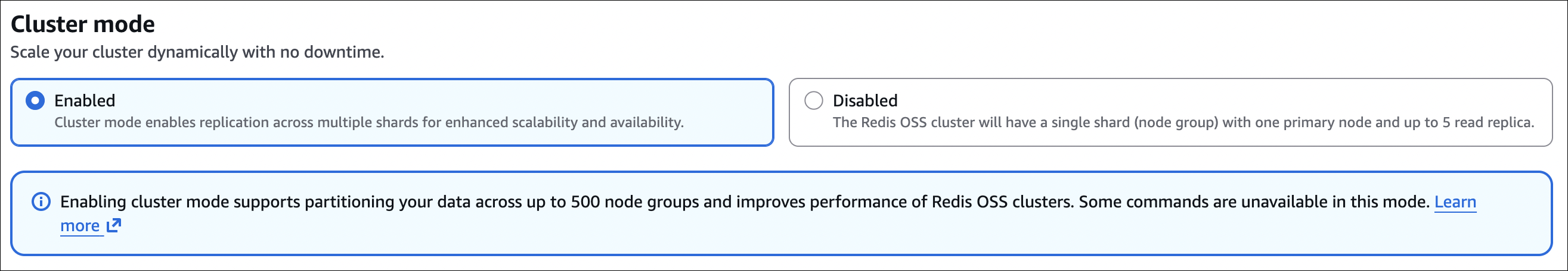 - Cluster mode: Disabled (single shard) or Enabled (multiple shards)