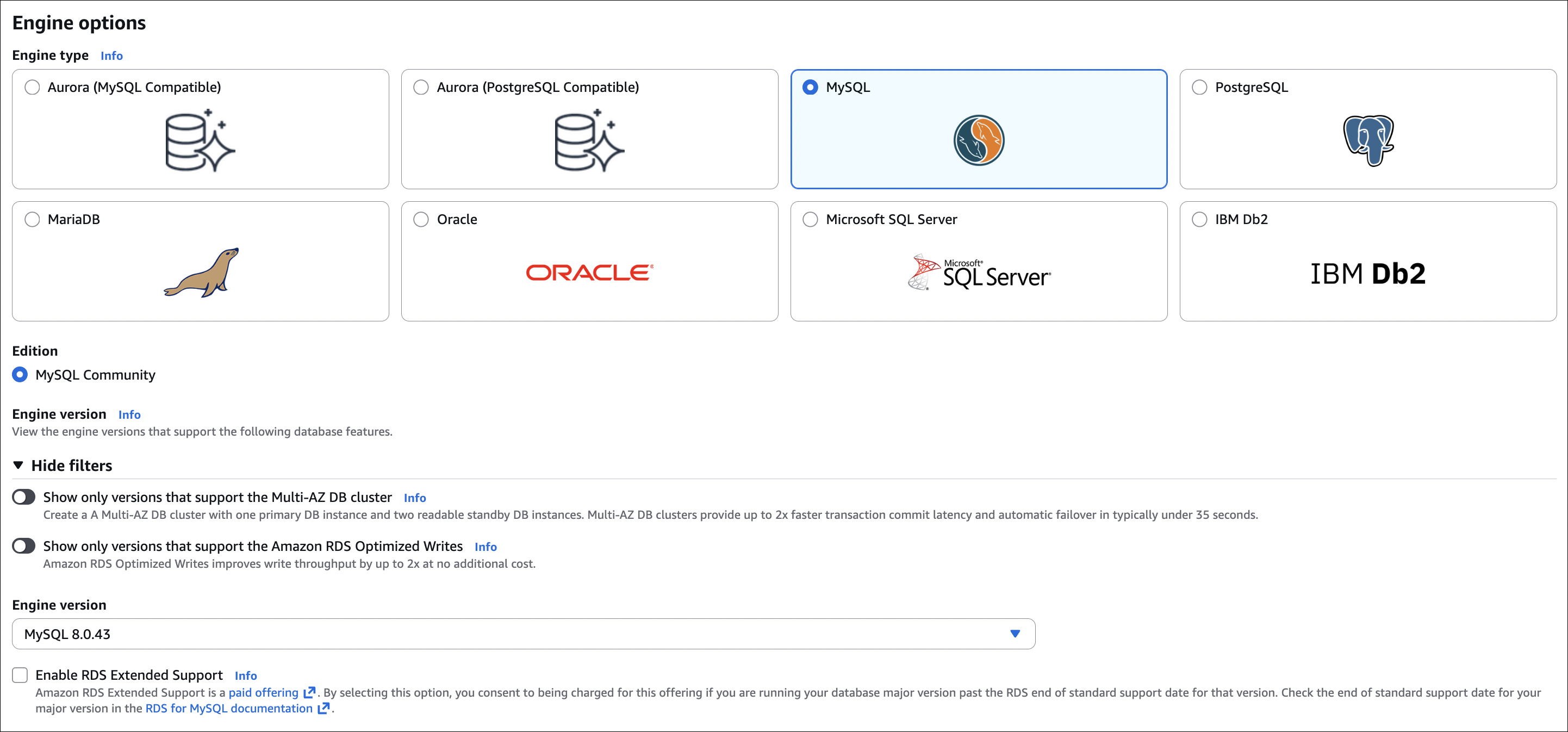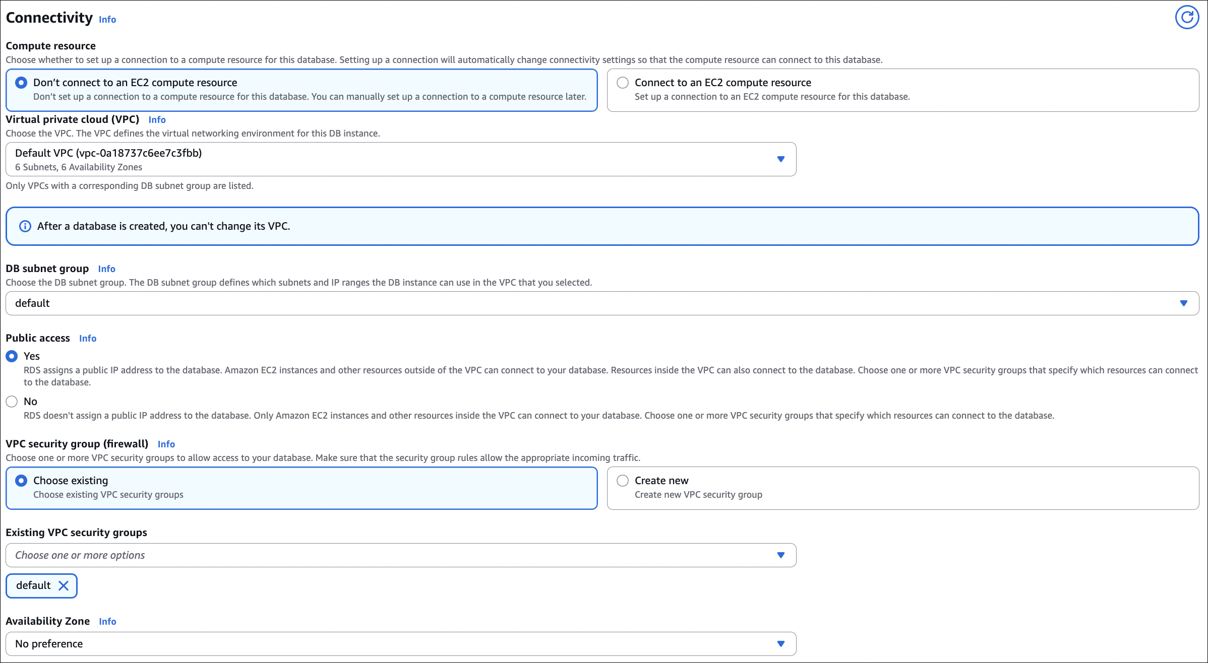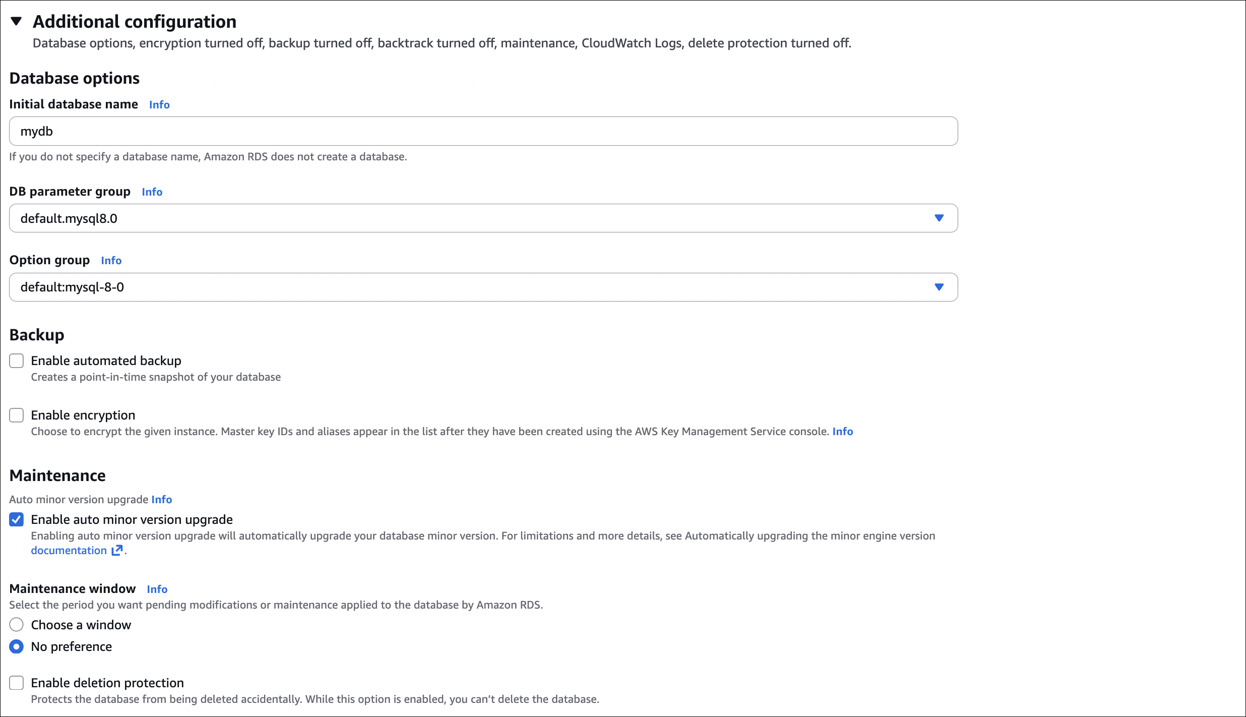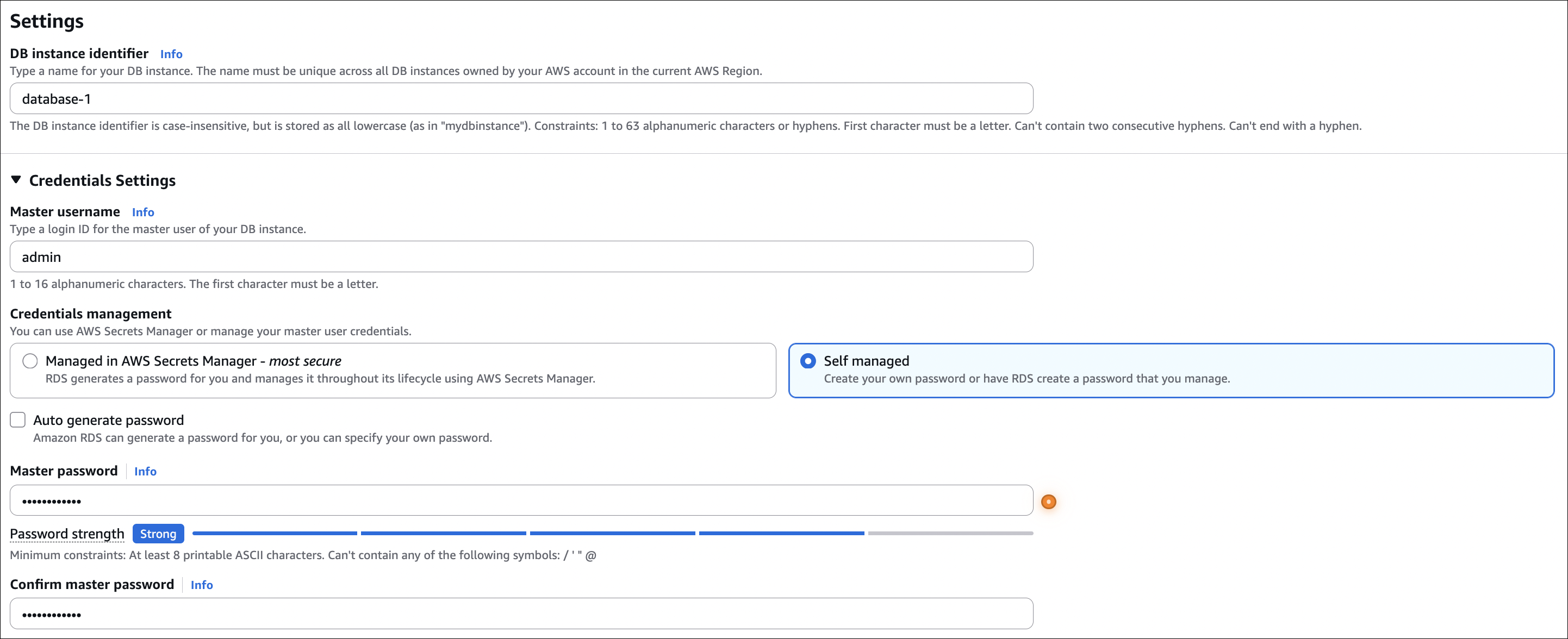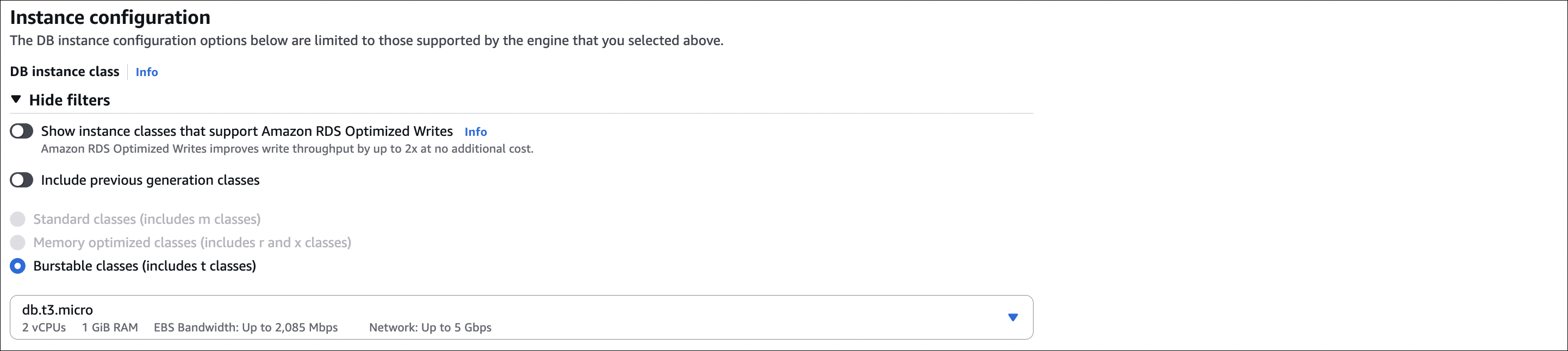 - DB instance class: db.t3.micro (free tier) or db.t3.small