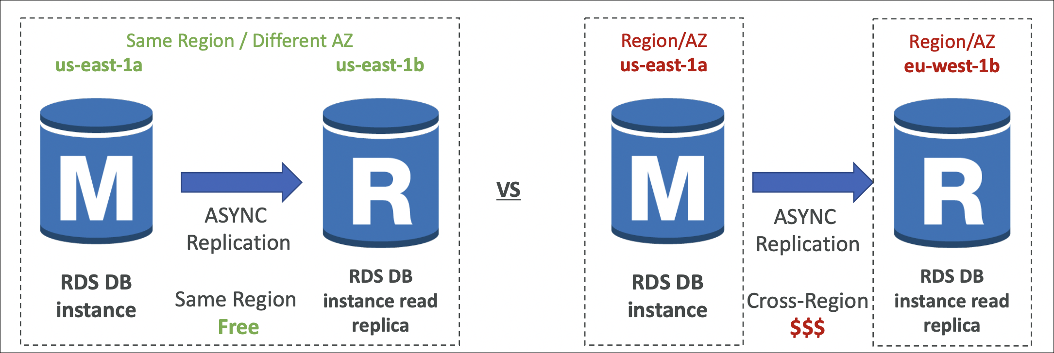 - Primary: us-east-1a, Replica: us-east-1b (same region) → FREE
